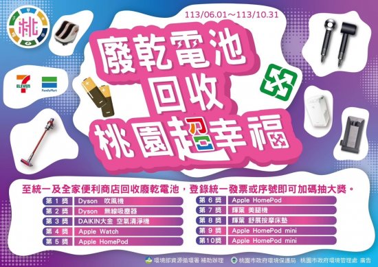 主旨: 有關本局於 113 年 6 月 1 日起至 10 月 31 日期間,結合統一超商及全家便利商店辦理「廢乾電池回收 桃園超幸福」廢乾電池回收加碼活動案,惠請廣為宣傳,請查照。