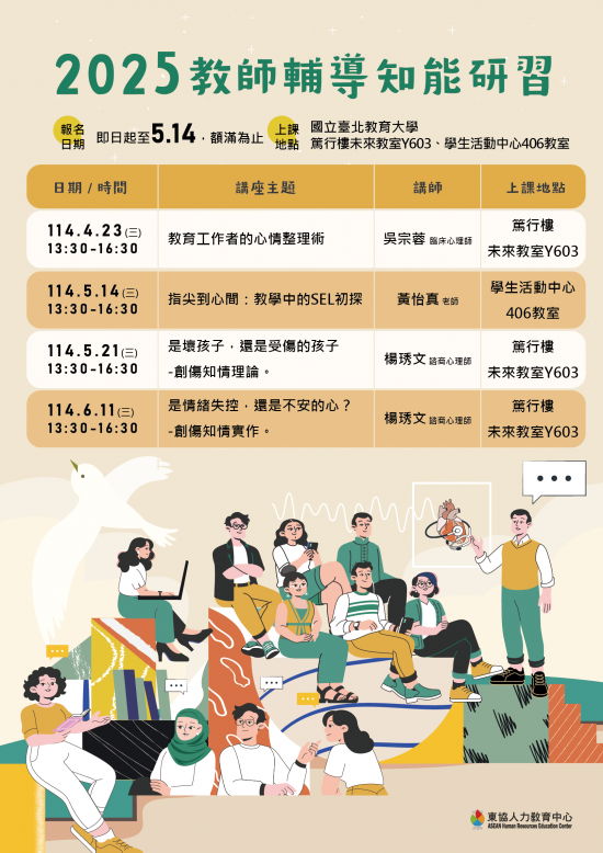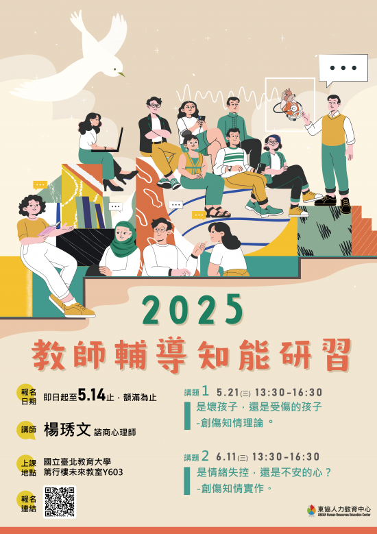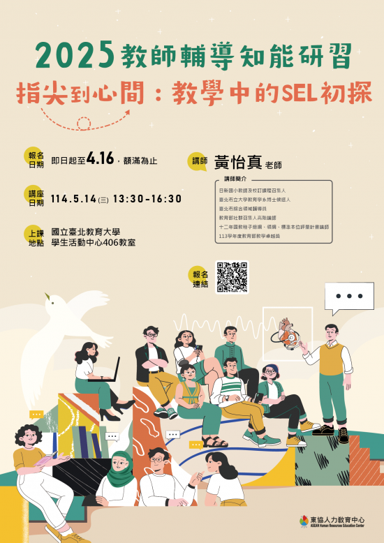 | 主旨: | 本校東協人力教育中心舉辦「教育部 114 年度社會責任實踐計畫-2025 教師輔導知能研習」,敬請推薦貴校教師及教支人員報名參加並予以公假,請查照。 |