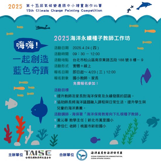 | 二、 | 本次工作坊為本會主辦之「第 15 屆氣候變遷國中小繪畫創作比賽」之延伸活動,該比賽由教育部、環境部及海洋委員會指導辦理。本次工作坊以「嗨海!一起創造藍色奇蹟」為主題,內容涵蓋海洋保育、永續發展及繪畫藝術的融合應用,並與 4 月 22 日世界地球日之精神相呼應。 |