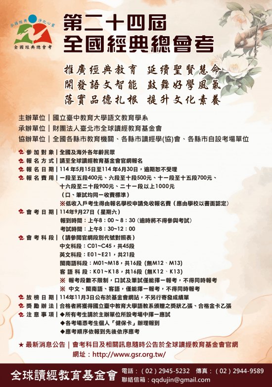 轉知財團法人臺北市全球讀經教育基金會辦理「第 24 屆全國經典總會考海報」