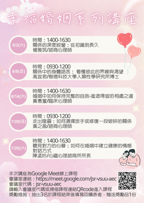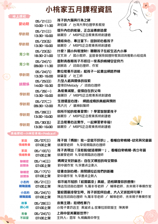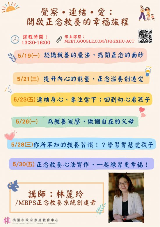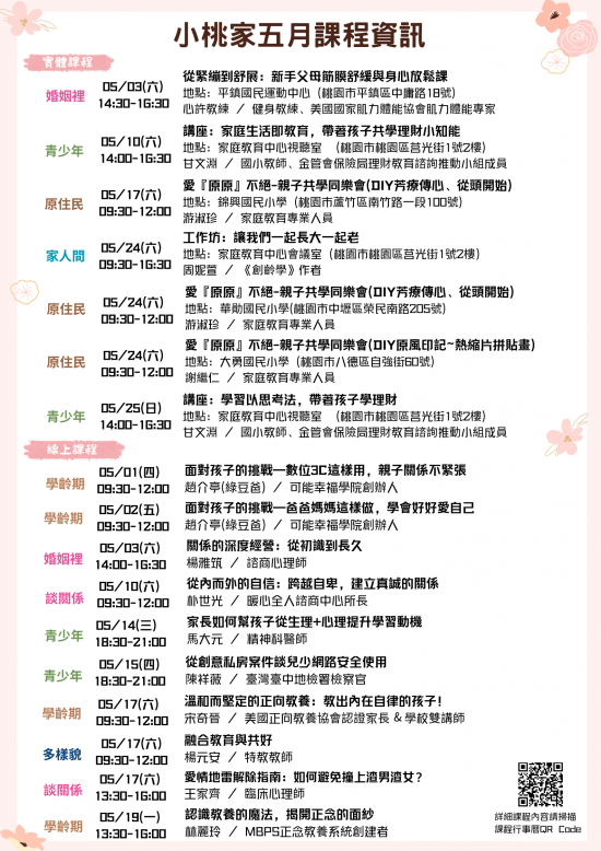 | 主旨: | 檢送本中心「小桃家 5 月課程資訊」、「親子理財教育講座」、「愛『原原』不絕-親子共學同樂會」、「覺察・連結・愛:開啟正念教養的幸福旅程」、「幸福婚姻系列講座」海報各 1 份,惠請貴機關(學校)運用多元管道宣導,請查照。 |