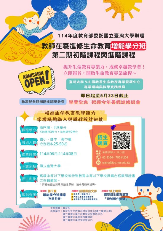 | 主旨: | 教育部委託本校生命教育研發育成中心辦理「114 年度教師在職進修生命教育增能學分班」,請貴校惠予轉知所屬教師踴躍報名參加,請查照。 |