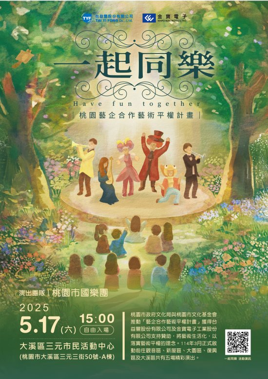 | 一、 | 本活動預定於 114 年 5 月 17 日(星期六)下午 3 時,邀請「桃園市國樂團」於大溪區三元市民活動中心(桃園市大溪區三元三街 50 號-A 棟)辦理演出。 |