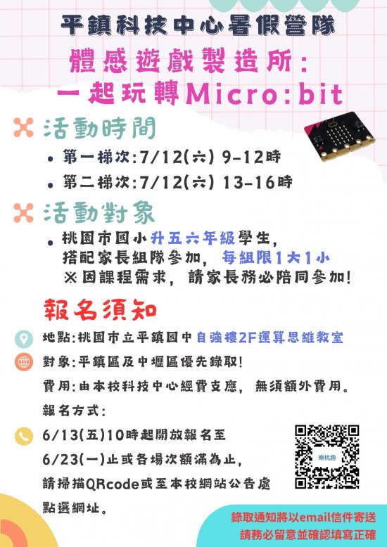 | 主旨: | 有關本校辦理平鎮自造教育及科技中心 114 年七月暑假親子營隊「體感遊戲製造所:一起玩轉 Micro:bit」,敬請協助公告周知,活動辦法詳如說明,請查照。 |