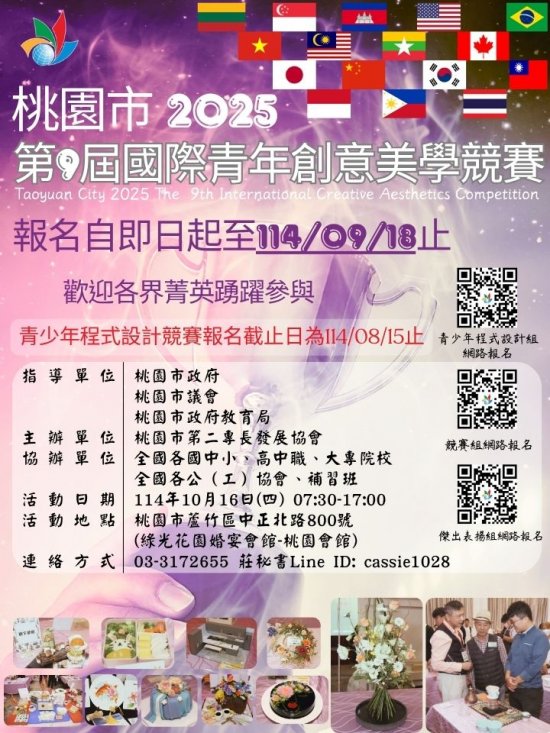 | 主旨: | 函送本會辦理之「桃園市 2025 第九屆國際青年創意美學競賽」競賽簡章及宣傳海報各乙份,歡迎貴校師生踴躍報名參加,敬請 查照。 |