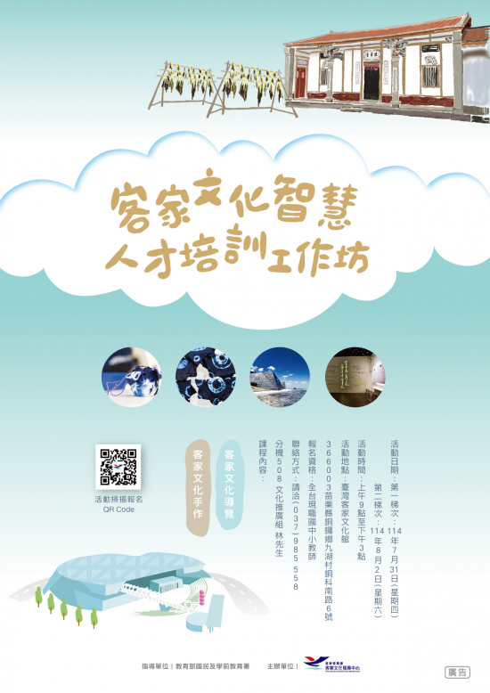 | 主旨: | 轉知客家委員會客家文化發展中心於 114 年 7 月 31 日及 8 月 2 日辦理「客家文化智慧教育人才培訓工作坊」一案,請鼓勵貴校教師踴躍報名參加,請查照 |
