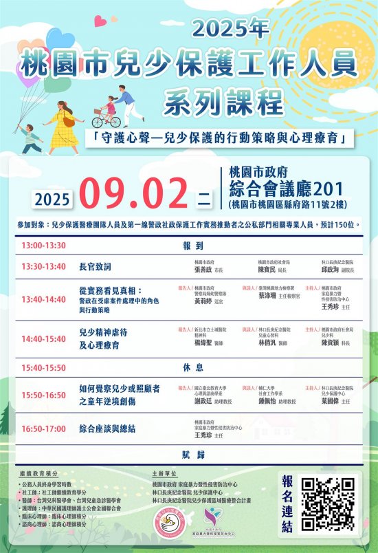 | 主旨: | 轉知有關長庚醫療財團法人林口長庚紀念醫院兒少保護中心與本府家庭暴力暨性侵害防治中心共同主辦「2025 年桃園市兒少保護工作人員系列課程守護心聲-兒少保護的行動策略與心理療育」一案,鼓勵相關人員踴躍參與,詳如說明,請查照。 |