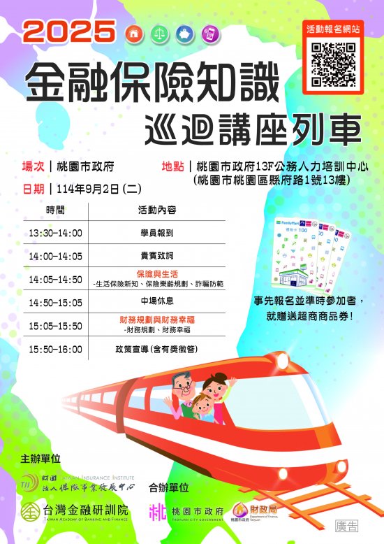 | 二、 | 為期本市社會大眾建立正確金融權益與保險規劃觀念,並培養終身學習金融知識之習慣,本府與保發中心共同舉辦旨揭活動。本活動訂於 114 年 9 月 2 日(星期二)下午 2 時至 4 時(下午 1 時 30 分開始報到),假本府公務人力培訓中心(地址:桃園市桃園區縣府路 1 號 13 樓)舉行,本次活動為免費公益活動,內容包括「保險與生活」、「財務規劃與財務幸福」及「金融政策、 ESG 永續金融及性別平等宣導」(含有獎徵答),隨函檢附活動計畫書及海報各 1 份。 |