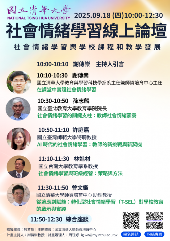 | 二、 | 查旨揭論壇聚焦 SEL 於課堂實踐、教師素養培養、 AI 時代挑戰、班級經營及 T-SEL 應用等,透過專家講座與實務交流,探討 SEL 如何融入課程與教學,促進師生關係與學生發展,辦理相關資訊如下: |