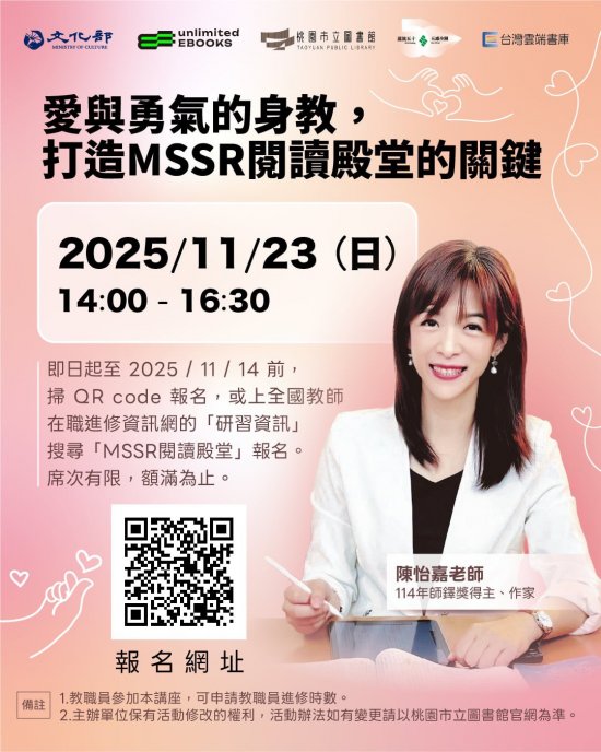 | 主旨: | 本館與遠流出版事業股份有限公司於 114 年 11 月 23 日舉辦「愛與勇氣的身教,打造 MSSR 閱讀殿堂的關鍵」講座,請貴校惠予協助宣傳,請查照。 |