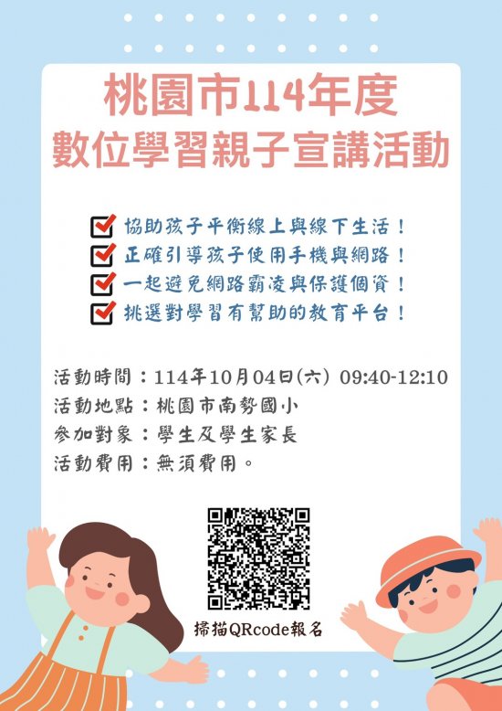 | 主旨: | 有關桃園市 114 年度「推動中小學數位學習精進方案」親子宣講暨種子教師培力計畫-南勢國小場次,請貴校協助公告活動訊息及鼓勵家長踴躍參加,請查照。 |