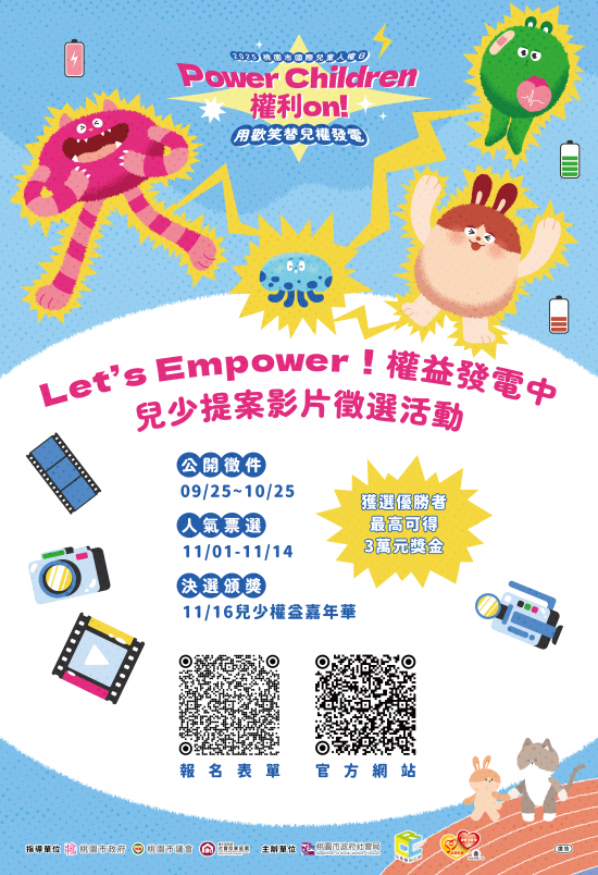 | 主旨: | 有關桃園市政府社會局辦理桃園市響應國際兒童人權日「Let’s Empower! 權益發電中」兒少提案影片徵選活動一案,請協助登載於資訊平台或社群網站,並鼓勵兒少踴躍報名,請查照。 |