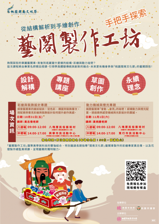 | 二、 | 本次徵件期間舉辦 4 場次「藝閣製作工坊」, 114 年 10 月 31 日及 11 月 1 日於中壢區、八德區辦理,邀請專業名師引領民眾認識藝閣工藝結構與設計原理,包括車體組成與造景、彩繪、動力機械、燈光,及環保創作介紹。 |