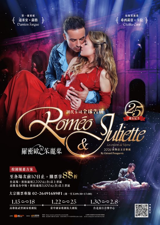 | 一、 | 經典法文音樂劇《羅密歐與茱麗葉》自 2001 年在巴黎首演即轟動全球,以磅礴動人的音樂、現代感十足的編舞與都市巴洛克風格美學,重新詮釋莎士比亞經典悲劇,劇中更以紅與藍兩大色系象徵家族對峙,展現強烈視覺張力;而初代卡司的演出早已成為大眾心中難以取代的記憶,本次適逢音樂劇 25 周年同時也是初代卡司告別巡演,讓這次在台灣的演出更具紀念性。法文音樂劇以獨樹一格的「演唱會」形式製作打造,特別強調「音樂」與「演員魅力」,以「歌」帶「戲」是法式音樂劇製作的順序與模式,藉由歌曲詠唱以及雋永詞彙的表達,再加上多樣化背景音樂襯托,讓演員的情緒起伏及情感傳遞更加深刻。誠摯推薦師生前來觀賞國際級精彩演出,並藉此增進對各類表演類型的了解。 |