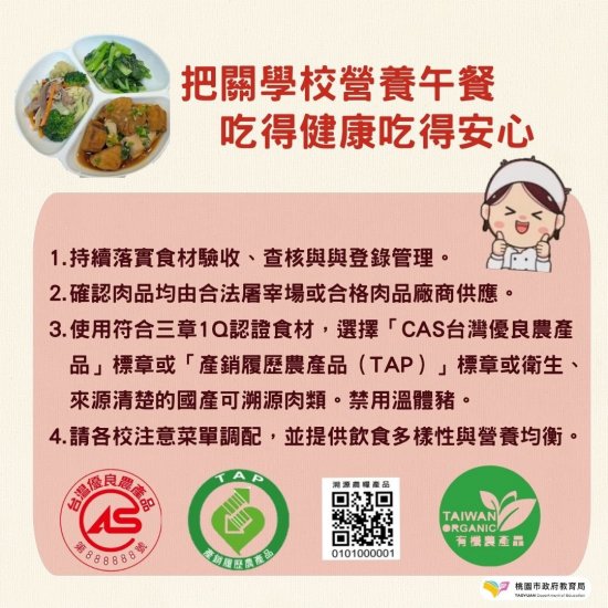 1.因應疑似非洲豬瘟案例"並依照市府函文(桃教體字第 1140106784 號及第 1140106835 號)規定辦理,本校為穩定供應午餐,且兼顧營養與安全的原則下,除了適時調整菜單,仍應符合學生營養需求。 2.自下週一(11/3)起,菜單將採購「衛生且來源清楚的國產可溯源肉類-CAS 豬肉相關產品」,或其他蛋白質食材。 3.日常生活中落實惜食行動,包括:購買適量食材、善用剩食、外食打包、分享多餘食物等,並透過妥善規劃餐食分量與食材保存方式,以有效減少廚餘產生。 4.另附中央災害應變中心非洲豬瘟資訊專區(https://asf.aphia.gov.tw/index.php)網址,請同仁參考,謝謝。