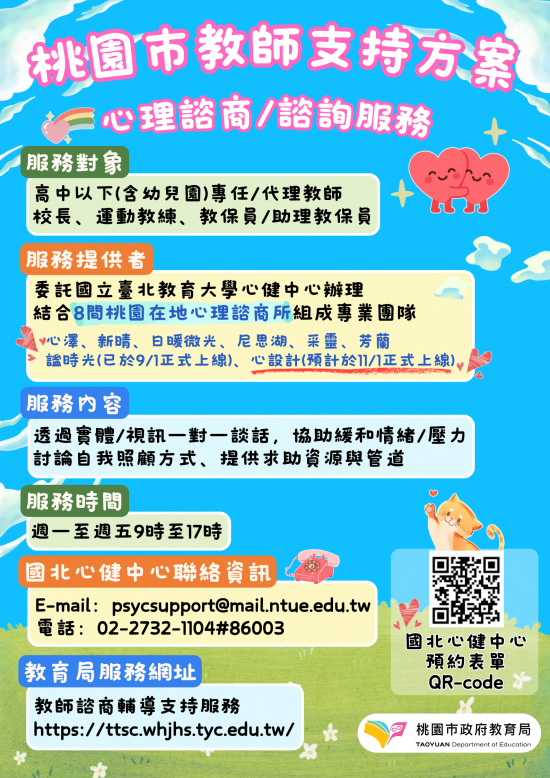 | 主旨: | 有關桃園市「114 年度教師諮商輔導支持服務」新增合作諮商所一案,詳如說明,請查照。 |