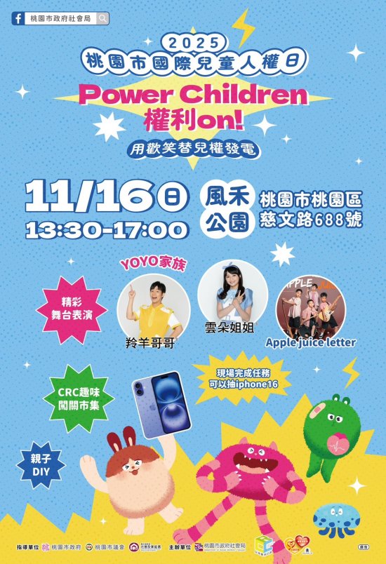 | 主旨: | 有關桃園市政府社會局辦理「114 年度國際兒童人權日「Power Children 權利 On! 用歡笑替兒權發電」系列活動資訊一案,請查照。 |