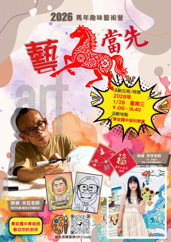 | 主旨: | 檢送桃園市立安東國民中學辦理「桃園市 115 年度寒假學生藝術才能潛能營--2026 藝馬當先-馬年趣味藝術營」招生訊息,敬請協助公告,並鼓勵貴校學生踴躍參加,詳如說明,請查照。 |