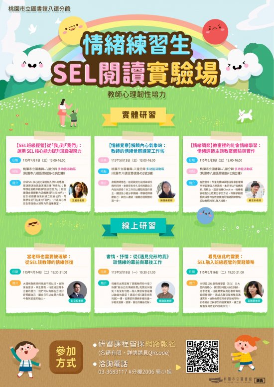 | 主旨: | 檢送本館八德分館 115 年第二季閱讀推廣活動「情緒練習生: SEL 閱讀實驗場」針對教師辦理系列研習活動宣傳海報電子檔 1 份,敬請貴機關(校)鼓勵所屬同仁踴躍參加,請查照。 |