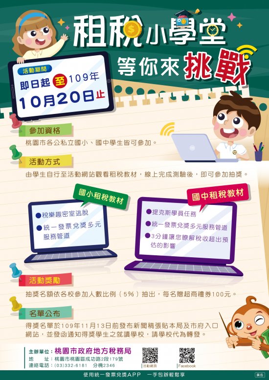 四、詳情請參閱活動辦法或至本局網站(https://tytax.tycg.gov.tw/),於宣導園地項下活動主打星查詢。