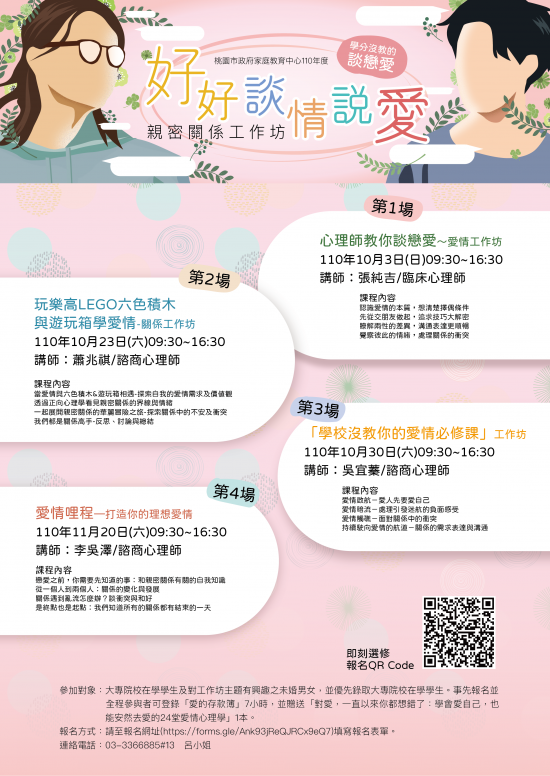 | 一、 | 依據桃園市政府家庭教育中心 110 年度「親密關係工作坊-好好談情說愛」實施計畫辦理。 |