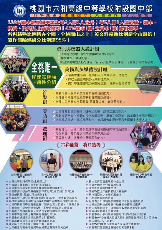 | 一、 | 本校附設國中部,是全桃園唯一採部定課程與適性分組的學校,開設資訊與機器人設計組、美術與多媒體設計組、管樂組、雙語組及數理組等五組特色課程。 |