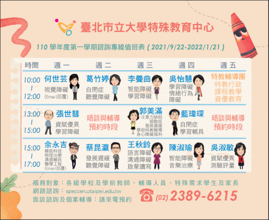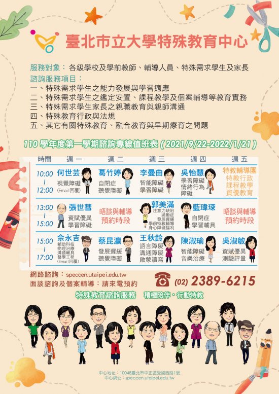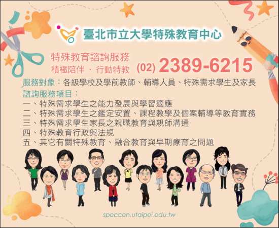 一、 依據臺北市立大學 110 年 10 月 1 日北市大殊字第 11060232722 號函辦理。 二、 該中心提供特殊教育電話諮詢服務、網路諮詢服務、個案晤談與輔導服務、到校訪視與輔導服務、特教知能研習等多元服務,中心網站另置有特教期刊、叢書、教材電子檔可供下載,請轉知貴校教師、輔導人員、教保員、行政人員、特殊需求學童及其家長多加利用,詳情請上該中心網站( speccen.utaipei.edu.tw )或致電洽詢(電話: 02-2389-6215 )。
