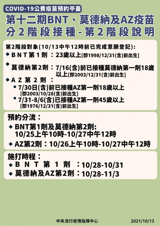 (二)第 12-2 期莫德納二劑: 110 年 7 月 16 日(含)前已接種第一劑 18 歲以上均可預約(預約時間 10 月 25 日上午 10 時至 10 月 27 日中午 12 時)
