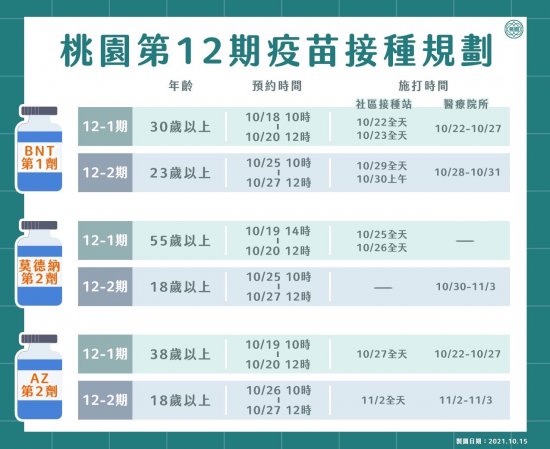 二、目前本市第 12 期 COVID-19 疫苗規劃已規劃開放 18 歲以上對象預約接種,規劃內容如下,請各校(園)鼓勵教職員工多加利用 COVID-19 公費疫苗預約平台進行意願登記及預約接種,並掌握校內教職員工接種 COVID-19 疫苗第一劑及第二劑情形,餘依本局 110 年 10 月 5 日桃教體字第 1100091491 號函(諒達)辦理: