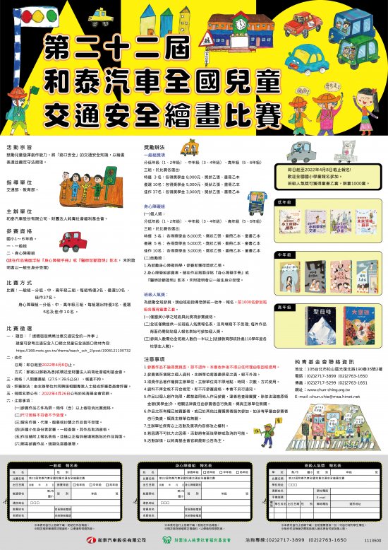 主旨: 函轉財團法人純青社會福利基金會辦理「第 22 屆和泰汽車全國兒童交通安全繪畫比賽」活動訊息 1 份,詳如說明,請查照。