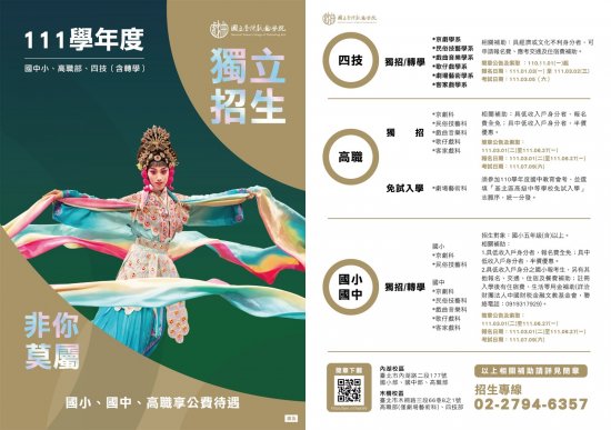 | 主旨: | 函轉國立臺灣戲曲學院 111 學年度國小部獨立招生(含轉學考) DM 及簡章一案,詳如說明,請查照。 |
