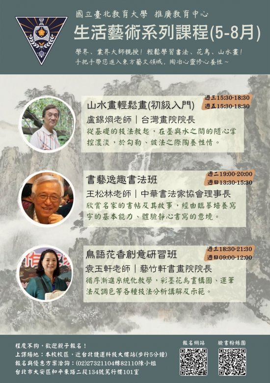 【轉知】「書藝逸趣書法班、鳥語花香創意研習班、山水畫輕鬆畫(初級入門)」招生訊息