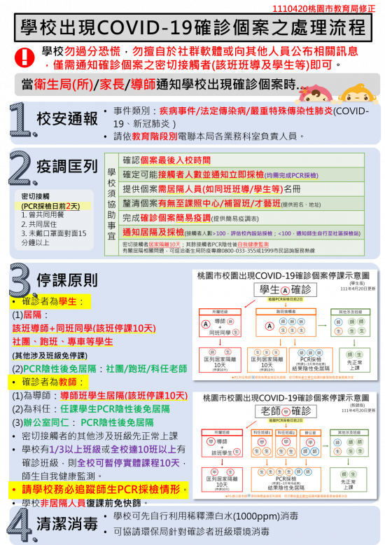 有關本校因應校園出現 COVID-19 確診個案之處理流程,均依據桃園市政府於 111 年 4 月 20 所頒之最新指引辦理,請參閱附件。