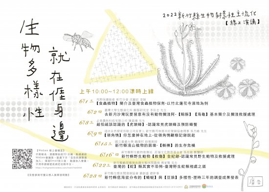 二、 響應 522 國際生物多樣性日慶祝活動,辦理旨揭系列演講,邀請保育夥伴,分享豐富的在地生物多樣性知識及保育工作故事,內容從稀有的食蟲植物,繽紛多彩的蜻蜓,難得一見的領角鴞幼鳥觀察紀錄,到大眾誤解很深的蛇及虎頭蜂都有,本講座採 Webex 會議室全線上辦理,並授予公務人員學習時數,請惠予鼓勵所屬人員踴躍參加。