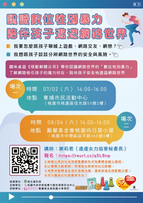 | (一) | 活動主題:【傳愛零距離‧幸福零暴力 性別暴力防治系列活動】認識數位性別暴力─陪伴孩子遨遊網路世界。 |