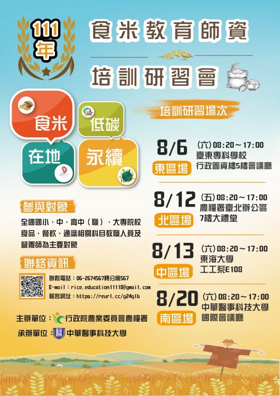 說明: 一、依據行政院農業委員會農糧署 111 年 7 月 1 日農糧產字第 1111090541 號 函辦理。 二、為推廣食米教育,該署針對不同教育階段學生規劃適合之 學習目標,深耕稻米知識、食米營養及正確飲食習慣等觀 念,以確實達到食米教育向下扎根之目的,並辦理旨揭師 資培訓研習會,課程導入「食米、在地、低碳、永續」特 色,培養學校教職人員及營養師深化稻米產業、米食知識 及新興米製食品等專業知能,以提升食米教育之成效,養 成學生以米為主食之飲食習慣。 三、旨案報名簡章及宣傳海報如附件,請轉知所屬人員參與, 有關參與研習公(差)假登記,請貴校本權責辦理。 四、研習相關問題請洽中華醫事科技大學林怡如小姐,電話: 06-2674567 轉 567 , E-mail : rice.education11118@gmail.com 。