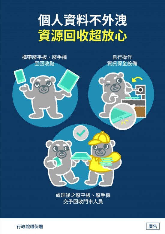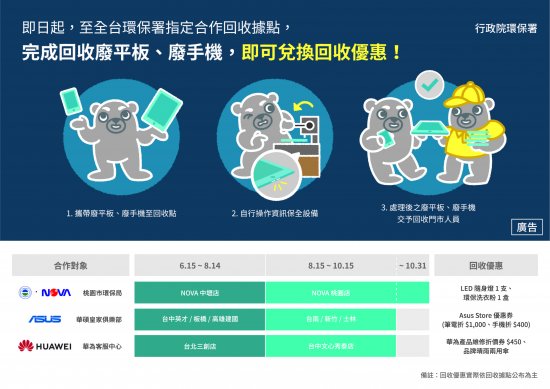 二、 行政院環境保護署為考量民眾對於資訊產品(如手機、平板電腦等)回收時容易衍生資料外洩之疑慮,故與本局及 NOVA 資訊廣場聯袂辦理旨揭活動,以提升資訊保全效益及現場回收換好禮。