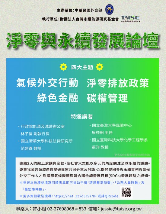 二、 由外交部主辦,該會執行之「2022 淨零與永續發展論壇」擬於 7 月 28 日(四)至 7 月 29 日(五)辦理,活動邀集產官學研專家,共同探討氣候外交行動、凈零排放政策、綠色金融與碳權管理等四大主題,同時培育我國氣候變遷與永續發展議題人才。