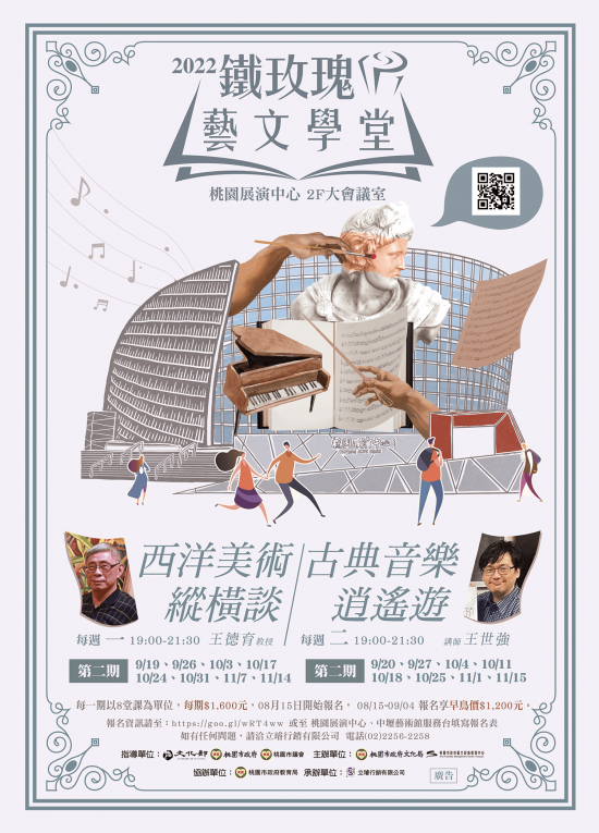 一、為推廣藝文教育,提升藝文賞析素養,桃園市政府藝文設施管理中心辦理《鐵玫瑰藝文學堂》系列課程,課程包括「西洋美術縱橫談」及「古典音樂逍遙遊」,自 9 月 19 日起於桃園展演中心 2 樓大會議室開課,每期 8 堂課報名費計 1,600 元整。