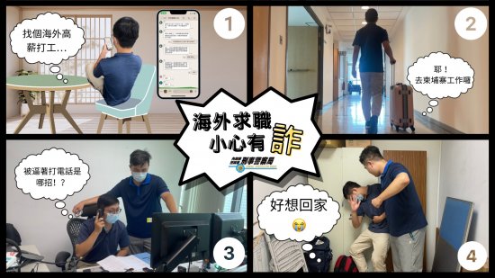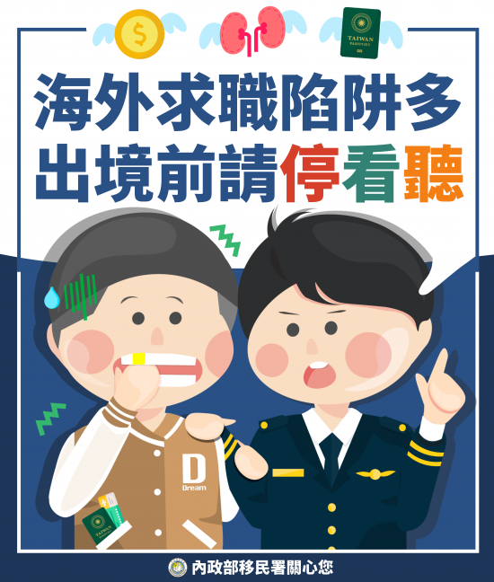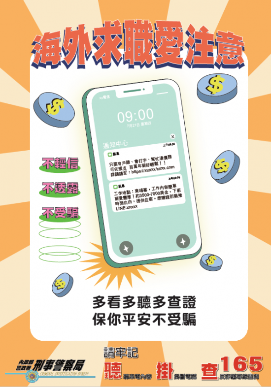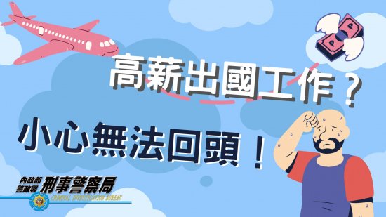 | 主旨: | 有關近期屢有國人被以「海外高薪打工」名義詐騙至國外,致財物受損並危及人身自由及安全等情事,為強化國人認知與警覺,內政部提供相關文宣資訊,請透過多元宣傳管道向民眾宣導,請查照。 |