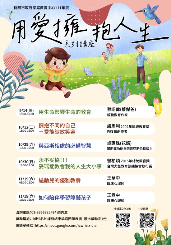 | 3、 | 與亞斯相處的必備智慧, 111 年 10 月 29 日(星期六)下午 13 時 30 分至 16 時,講師:卓惠珠(花媽)。 |
