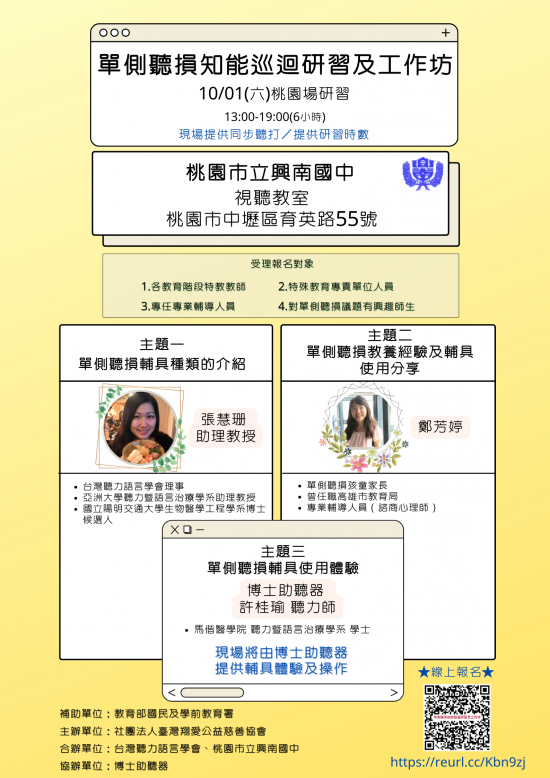 2、 全國特殊教育資訊網報名:至全國特殊教育資訊網 →研習報名→其他單位研習→單側聽損知能巡迴研習及工作坊(桃園場)(網址: https://special.moe.gov.tw/study_three.php?id=568202 )。