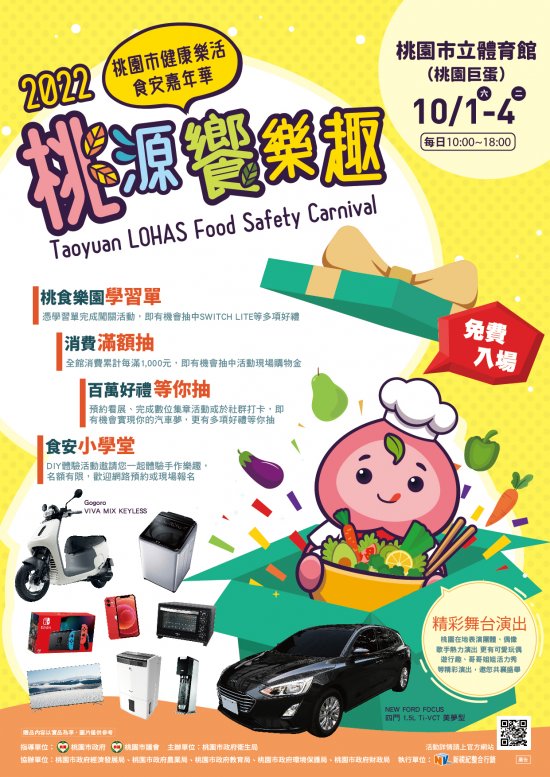 | 二、 | 活動於 111 年 10 月 1 日(六)~10 月 4 日(二)上午 10 : 00 至 18 : 00 假桃園市立體育館(地址: 桃園市桃園區三民路一段 1 號)辦理 111 年度桃園市「健康樂活食安嘉年華」活動。 |