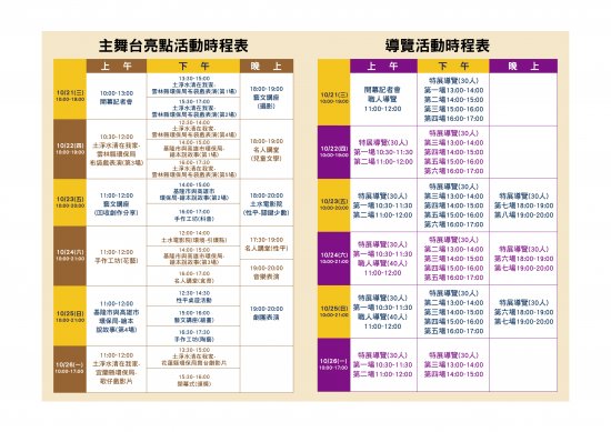 一、本次特展設計 10 大主題區,邀請 22 個縣市環保局共同參 展,透過藝文講座、手作工坊、繪本說故事、布袋戲、兒 童舞台劇、電影及樂團表演等,歡迎大家共襄盛舉。