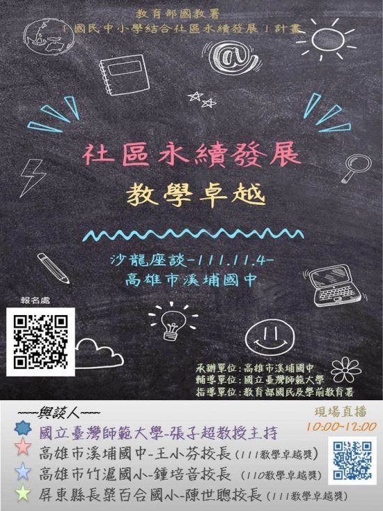 主旨: 有關教育部國民及學前教育署委請國立臺灣師範大學辦理「110 學年度國民中小學結合社區永續發展計畫」-【社區永續發展 X 教學卓越】-沙龍座談一案,詳如說明,請查照。
