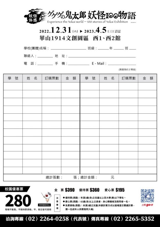 | 主旨: | 本公司訂於 111 年 12 月 31 日~112 年 4 月 5 日於華山 1914 文創產業園區西 1 、西 2 館舉辦「ゲゲゲの鬼太郎妖怪 100 物語」特展,敬請協助公告周知,鼓勵師生及家長踴躍參與,並規劃進行校外教學及其團體參觀之參考依據,請查照。 |