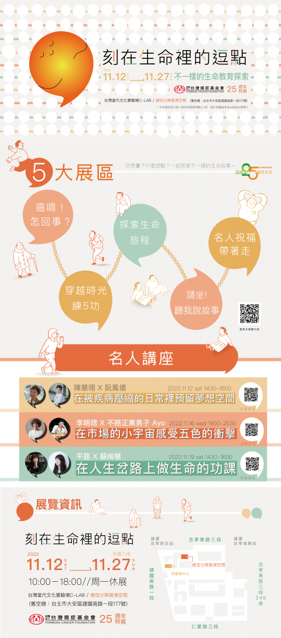 | 二、 | 基金會走過四分之一世紀,始終秉持初心-宣導「癌症不是絕症」、「癌症可以預防」,去除國人對癌症的恐懼與迷思,讓民眾從避諱談論,轉變為對自我健康的關注與管理,提升國人對癌症防治的重視。於成立 25 週年之際,特別策劃「刻在生命裡的逗點」特展,強化「互動」、「體驗」,以引領民眾進行身體及健康的對話,掌握預防癌症的關鍵,內容豐富精采寓教於樂,適合各年齡層參觀,闔家共賞! |