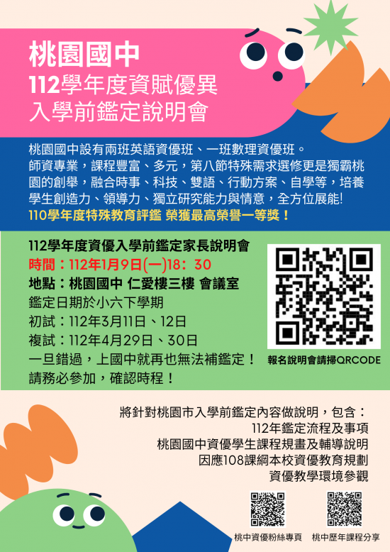 1、 桃園市 112 學年度資賦優異學生入學前鑑定流程及相關注意事項。