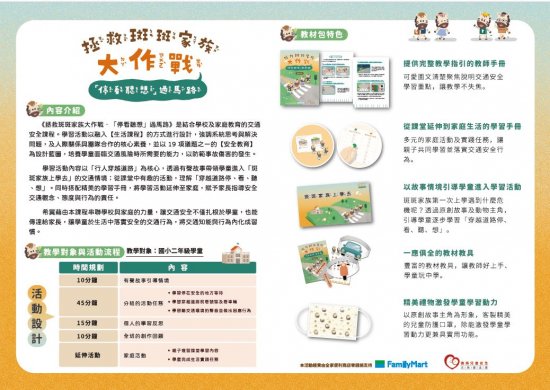 | 一、 | 教材包內容係以「行人穿越道路」為核心,並結合教師手冊、學習手冊、教具、教學簡報及宣導品,提供教師落實交通安全教育所需資源,申請流程及內容簡介詳見附件(報名簡章及 DM)。 |