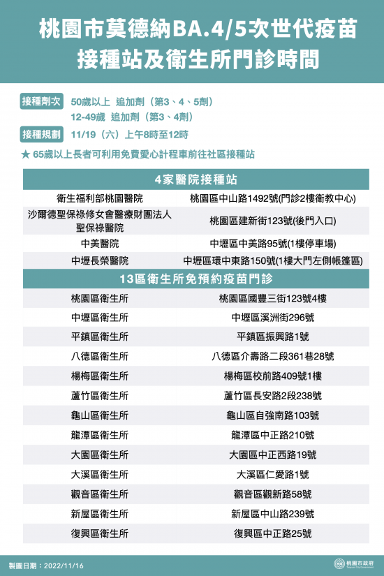 二、 本市於 111 年 11 月 19 日(星期六)上午 8 時至 12 時開設莫德納雙價疫苗(BA.4/5)接種站及衛生所門診,地點如下,請貴校轉知符合接種資格之教職員工生多加利用: